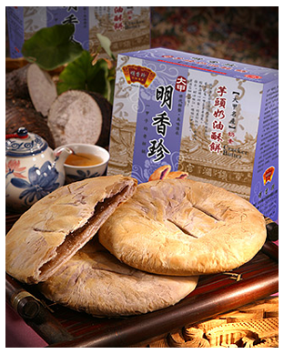 創新口感;以奶油原味酥餅為底,加上大甲特產的芋頭風味,經本店精心研製,造就今日的“芋頭奶油酥餅”,濃濃的奶油芋香,加上不甜不黏的芋頭麥芽餡,令人讚不絕口。